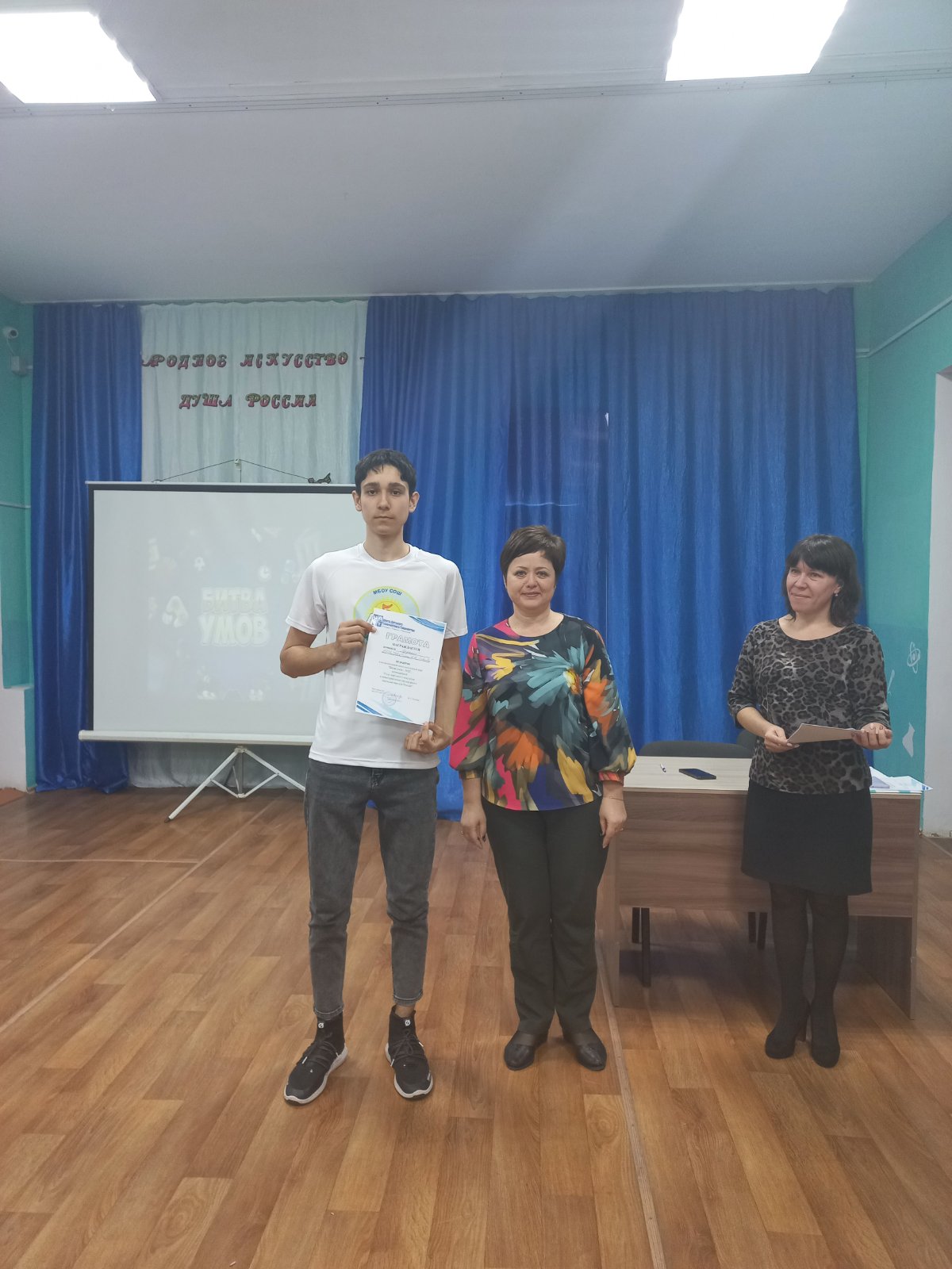 24 марта команда 8А класса "Дружина" приняла участие в весенней муниципальной интеллектуальной игре "Битва Умов", посвященной Году народного искусства и нематериального культурного наследия народов России.